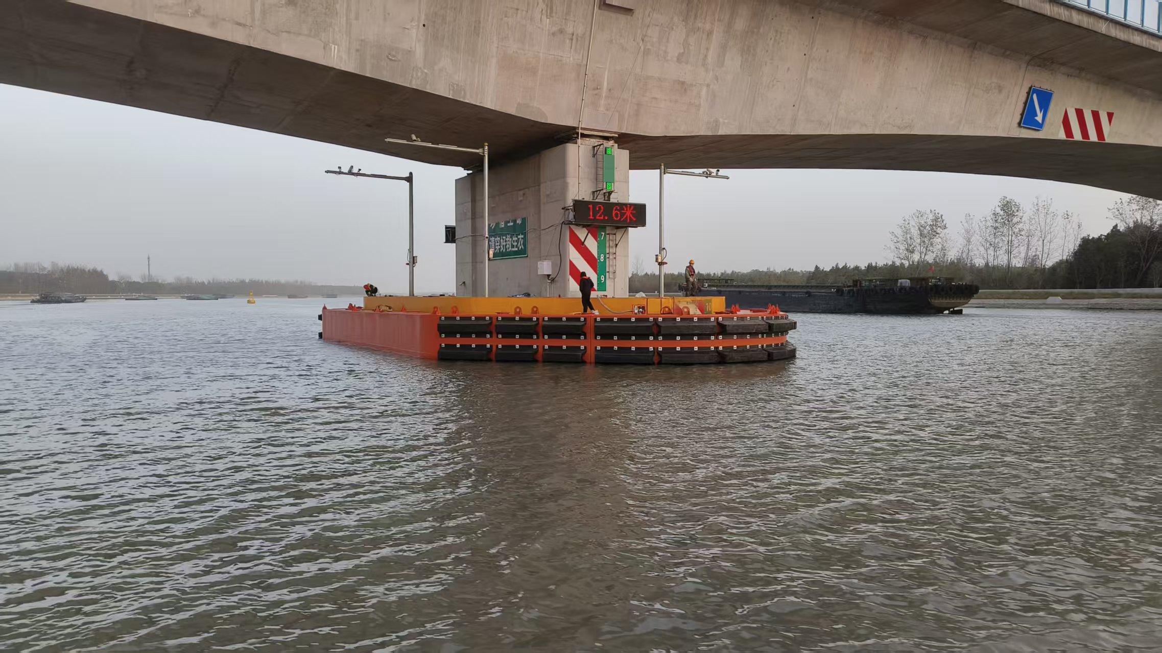 工程聚焦三大核心任务,对原有内防船撞设施开展精细化修复;拆除外防船撞设施,换装全新自浮式防撞钢套箱,其自适应浮动的特点,以灵动适配性守护主墩,始终提供环绕式保护,卓越的缓冲与吸能设计,能有效化解船舶撞击力,如同为桥墩穿上了一件坚固灵活的智能铠甲,守护桥梁安全。同时,沿设施布设警示照明灯带,白日醒目警示,夜间点亮江面,是指引船舶的安全信标,织密全天候安全网。
